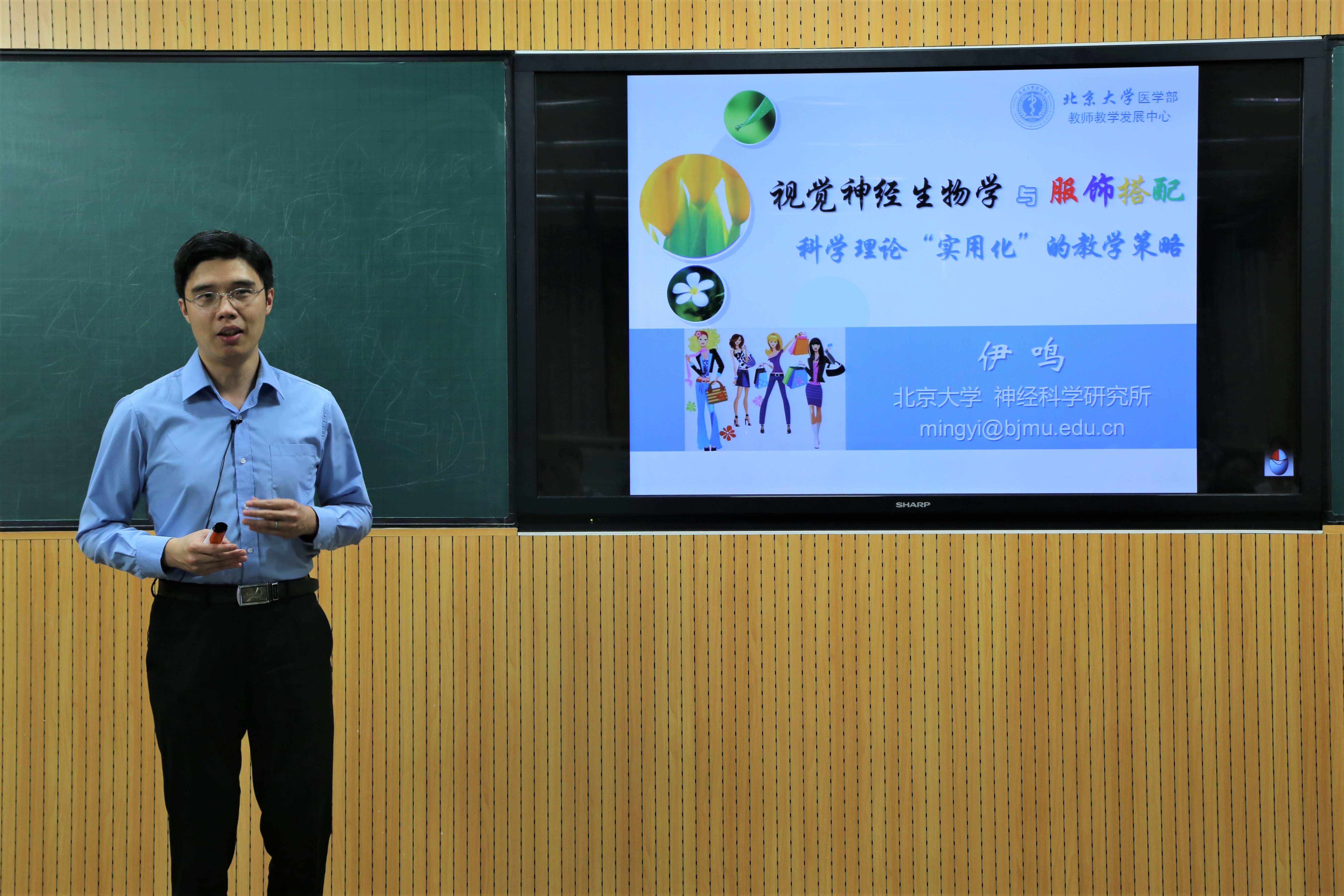 接着,伊老师以其神经生物学课程中“视觉”部分内容为例,展示如何将视觉神经生物学知识实用化为“如何搭配衣服显苗条”的生活问题。他从眼球、视网膜、神经节细胞等视觉单元的结构与功能特点,讲解了眼动、侧向抑制、视觉的并行处理、捆绑问题、视觉补全、下行控制等视觉神经生物学原理和规律,并将这些原理应用于日常穿衣搭配中,从款式、颜色、条纹、配饰四个方面,对如何进行服饰搭配给予了建议:侧向抑制的原因使得同色上衣和裤子搭配更显高且瘦,横条纹越多、竖条纹越少能越显瘦,散摆裙比一步裙显瘦;视觉的信息并行处理功能使得穿V型领更显身高;运用视觉补全原理,可以对胖的部位做适当遮挡,充分展示瘦的部位;下行控制原理使得高腰裙比低腰裙更显瘦,深色调比浅色调有更收缩的感觉等等,各种衣服搭配效果图片的比较让大家对这些视觉神经生物学的原理有了更深刻的理解。