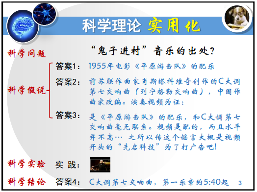 首先,伊老师以一个很生活化的问题“‘鬼子进村’音乐的出处”来说明很多时候可以用解决科学问题的思路来解决日常问题:提出科学问题-设定科学假说-进行科学实验-得出科学结论。